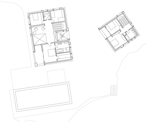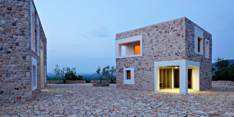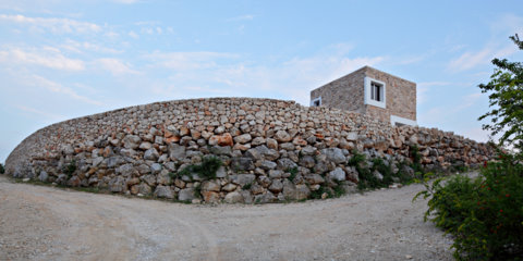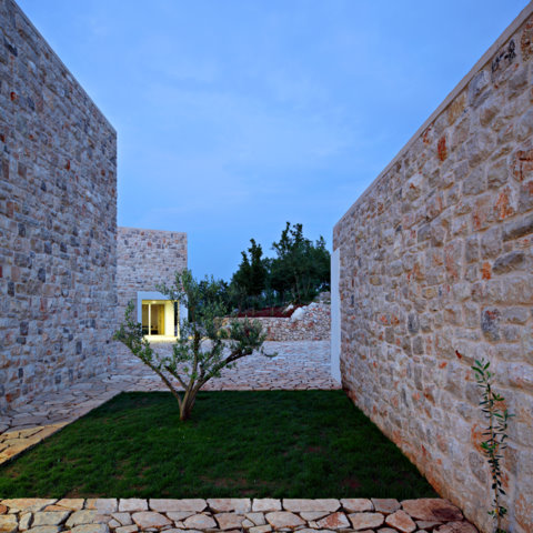 Na samom ulazu na parcelu definiranu suhozidom, nalazi se kuća domara i gospodarski objekt. Glavna kuća je pažljivo pozicionirana prema najpovoljnijim pogledima, te je u potpunosti fokusirana svojom dužom stranom na jugozapad. Kao rezultat ovog principa pojavljuju se otvori, izmaknuti i po vertikali i po horizontali s naglašenim apstraktnim okvirima kao parafrazom tradicionalnih detalja.