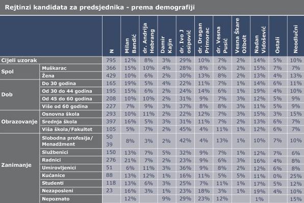 Demografski pokazatelji otkrivaju još neke kuriozitete – umirovljenici, kao stabilno glasačko tijelo, i dalje su u ogromnom postotku za Josipovića (37 posto), a SDP-ov kandidat preuzeo je od Bandića vodstvo i među mlađima od 30 godina, među kojima zagrebački gradonačelnik bilježi strmoglavi pad potpore (sa 30 na 19 posto). Kad je riječ o obrazovanju, Ivo Josipović favorit je visokoobrazovanih glasača – čak 45 posto njih podržalo bi ga na izborima, a za njim slijede Nadan Vidošević (12 posto) i Vesna Pusić (11 posto potpore).