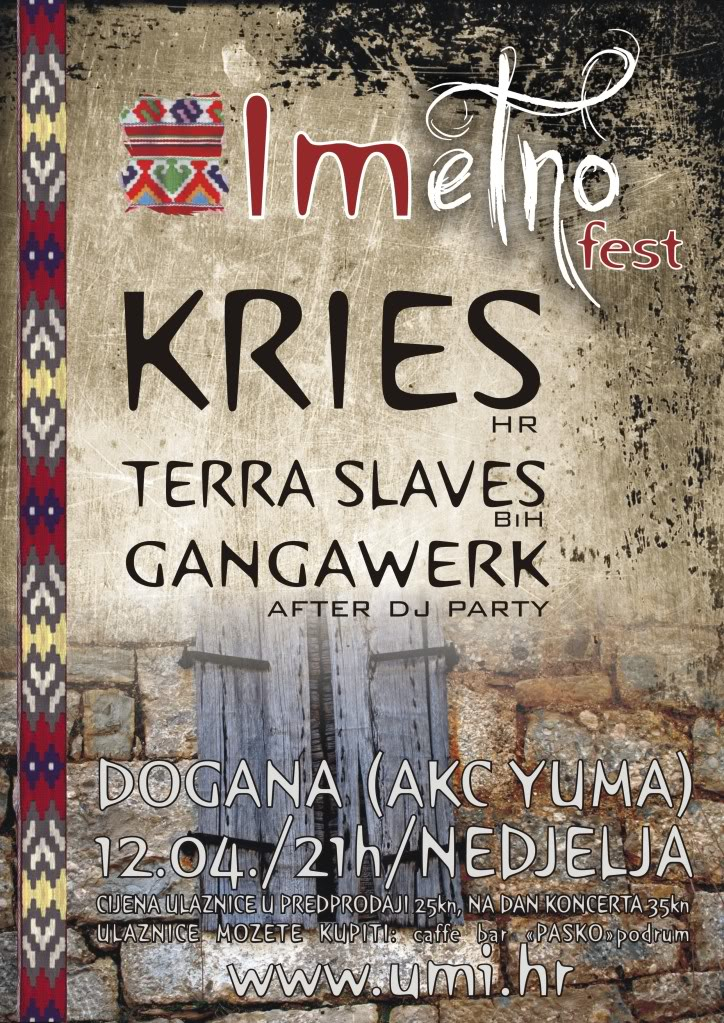 U organizaciji Udruge mladih Imotski u nedjelju, 12.04.2009. u Dogani (Alternativno-kulturni centar “Yuma”) održat će se po prvi put mali etno festival pod nazivom Imetno fest. Šačica alternativaca, entuzijastičnih ljudi okupljenih u Udrugu mladih za ovaj događaj pozvali su one koji uspješno bude tradicijske zvukove iz davnina i spajaju ih sa suvremenom glazbom , pa će nastupiti etno grupa Kries koja je mnogima ostala u sjećanju po nastupu na prošlogodišnjem West Herzegowina Festu, zatim bend Terra Slaves, te na kraju after DJ party „Gangawerk“. Ulaznice za Imetno fest se mogu naći u caffe bar Paško, cijena u predprodaji je 25 kn, a na sami dan koncerta 35 kn.