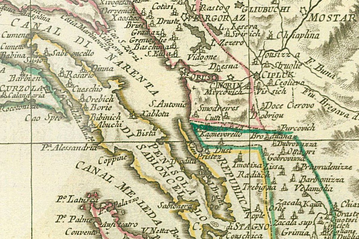 Javio nam se naš Radoslav Dodig koji je „naletio“ na jednu staru kartu što ju je pod nazivom Dalmazia Veneta 1784. izradio autor Giovanni Valle. Karta se čuva, našoj Vladi za informaciju, u Biblioteca Nazionale Marciana, Venezia. Na isječku karte vidi se šire područje granice na Kleku, gdje je žuto ocrtan teritorij Dubrovačke Republike, koja je imala cijeli poluotok Klek. Vidljivo je da osmanski teritorij završava na obali Neuma i da Osmanlije nisu imale izlaz na otvoreno more, već samo tzv. mare clausum, zatvoreno more. Usput, kartograf nije bio vičan ispisivanju hrvatskih toponima pa ima zanimljivih oblika – piše nam Dodig.