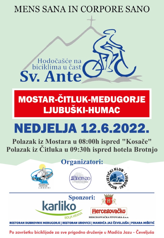 U organizaciji Društva pedagoga TZK Ljubuški, te biciklističkih klubova Brotnjo i Ljubuški u nedjelju 12.6. održati će se 14. tradicionalno biciklističko hodočašće u čast sv. Ante.