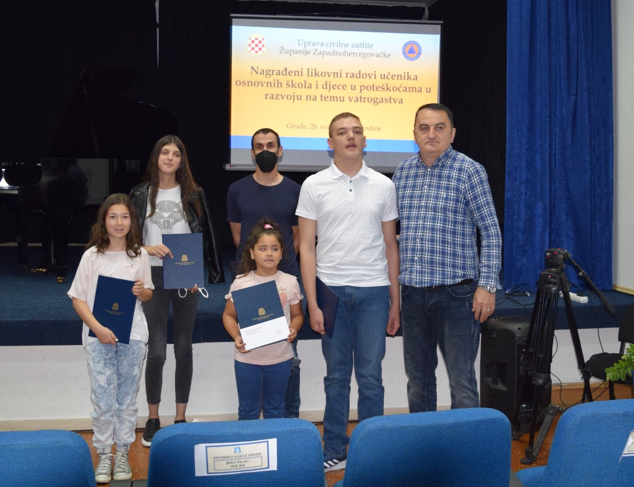 U organizaciji Uprave civilne zaštite Županije Zapadnohercegovačke u kino dvorani u Grudama održana je svečanost dodjele nagrada i priznanja djeci s poteškoćama u razvoju i učenicima osnovnih škola u Županiji Zapadnohercegovačkoj za najbolje likovne radove na temu vatrogastva.