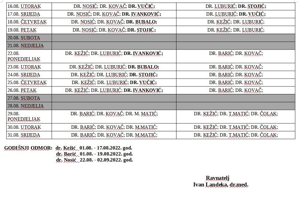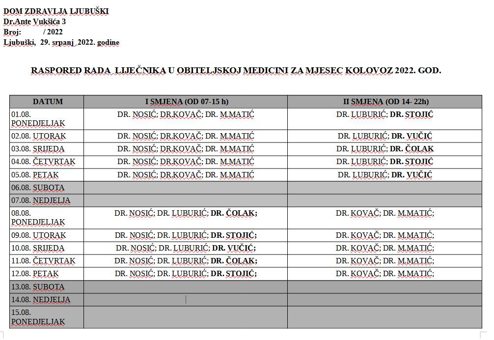 10.08.2022 Obavijesti Raspored rada liječnika u obiteljskoj medicini za mjesec kolovoz 2022. god. kol 10, 2022Slovojed