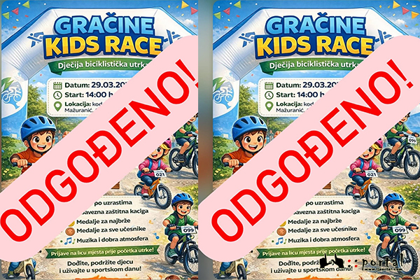 Planirana dječja biciklistička utrka „Gračine Kids Race“, koja se trebala održati u nedjelju, 29. ožujka, odgođena je zbog nepovoljnih vremenskih uvjeta. Organizatori su ovu odluku donijeli kako bi osigurali sigurnost svih sudionika, posebno najmlađih natjecatelja.