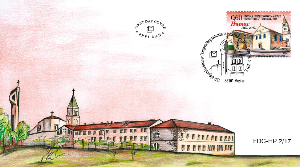 Poštanska marka „150. obljetinica obnove Franjevačkog samostana na Humcu tiskana je u arku od 9 maraka, a prate je žig i omotnica prvoga dana (FDC). Autorica izdanja je akademska slikarica Magdalena Džinić Hrkać, marka nominalne vrijednosti 0,60 KM tiskana je u tiskari Zrinski u Čakovcu, prvi dan izdanja 4. svibnja 2017.