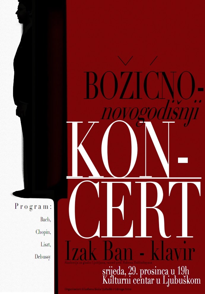 U srijedu, 29. prosinca 2021. u Ljubuškom će se održati koncert Izaka Bana, mladog slovenskog pijaniste porijeklom iz Ljubuškog.