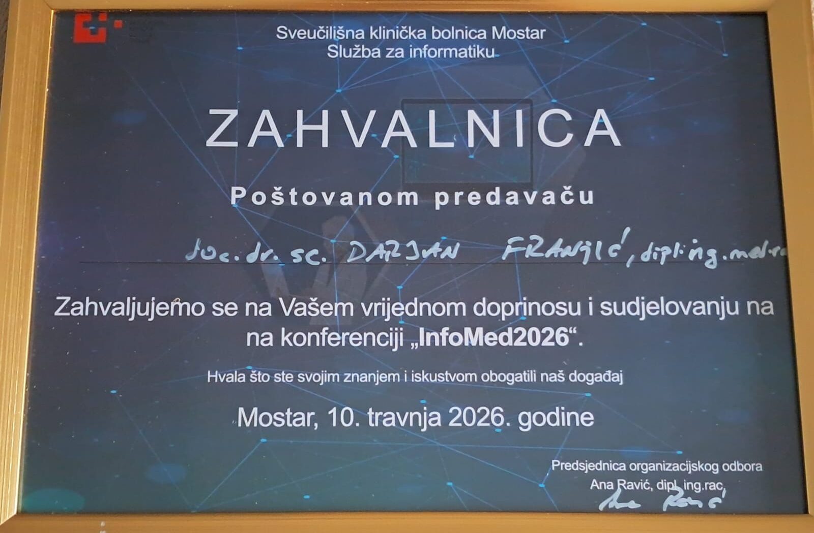 U amfiteatru Medicinskog fakulteta u Mostaru, u petak 10. travnja 2026. godine, održan je znanstveno-stručni simpozij InfoMed. Skup je okupio stručnjake iz regije i Europe s ciljem razmjene iskustava o umjetnoj inteligenciji u zdravstvenom sustavu, a među predavačima je sudjelovao i naš sugrađanin doc. dr. sc. Darjan Franjić, mag. rad. techn., voditelj kolegija Umjetna inteligencija u radiologiji.