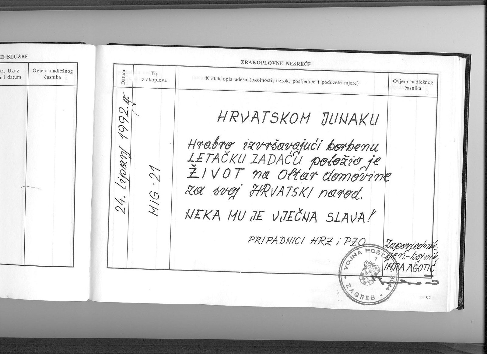 Tijekom izvršenja borbene zadaće između Prnjavora i Dervente 24. lipnja 1992. Borovićev nekadašnji zrakoplov je oboren, a u njemu je poginuo hrvatski pilot, pukovnik Antun Radoš. Bio je to prvi gubitak borbenog zrakoplova i pilota Hrvatskog ratnog zrakoplovstva”.
