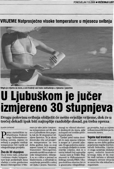 Nastavljamo s objavama u rubrici Iz nedavne prošlosti Ljubuškog. Ovaj put donosimo članak Večernjeg lista od 11. svibnja 2009. koji govori o neobično visokim temperaturama za ovo doba godine koje su u Hercegovini vladale prije točno 10 godina.