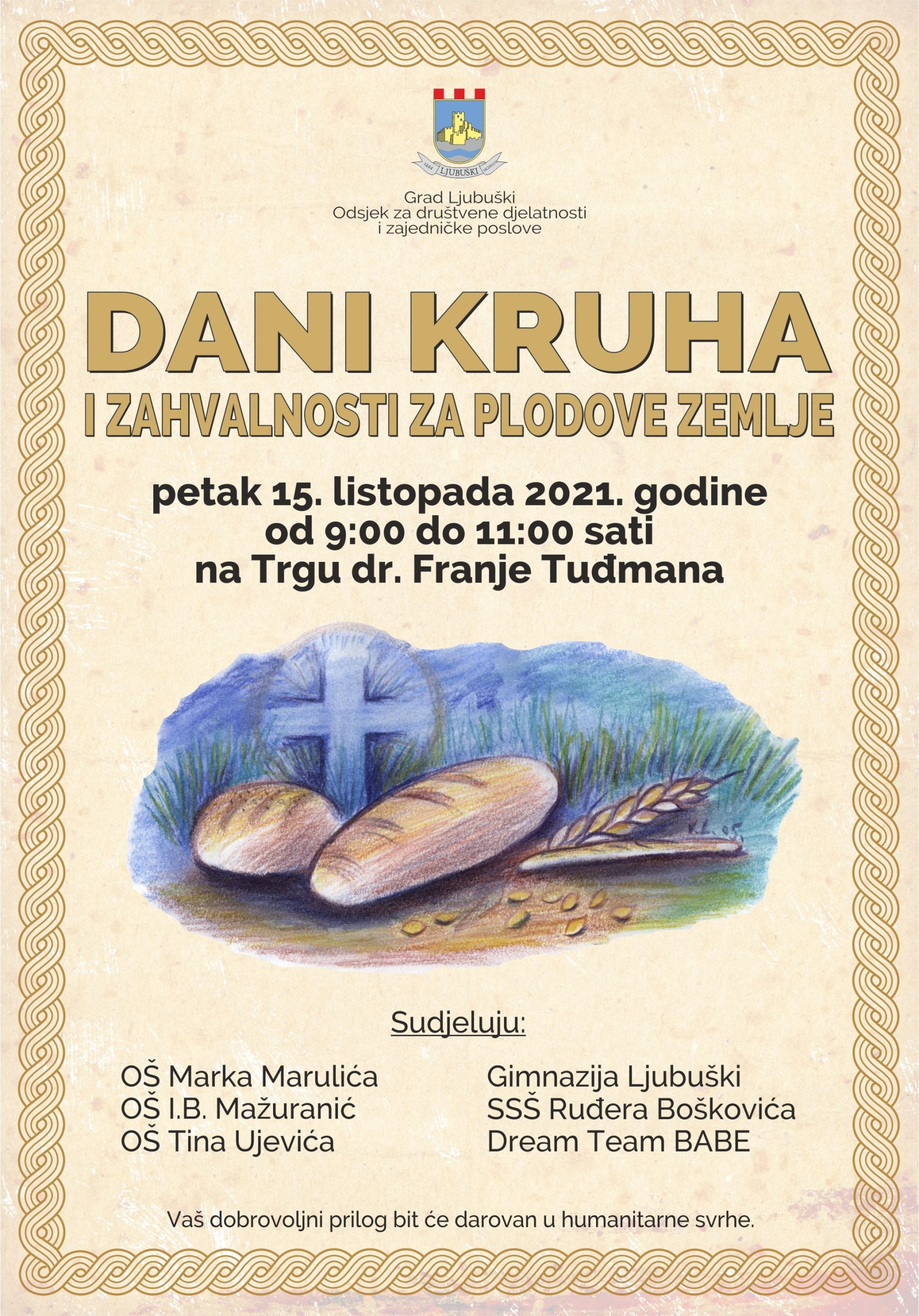 Tradicionalna manifestacija “Dani kruha i zahvalnosti za plodove zemlje” u organizaciji Odsjeka za društvene djelatnosti Grada Ljubuškog, održat će se po četrnaesti put u petak, 15. listopada u vremenu od 9 do 11 sati, na Trgu dr. Franje Tuđmana.