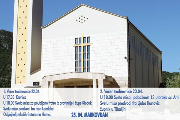 U četvrtak, 25. travnja 2024. godine, na svetkovinu svetoga Marka evanđelista, nebeskoga zaštitnika župe svečanu svetu misu u 18 sati predvodit će humački župnik i gvardijan fra Dario Dodig.