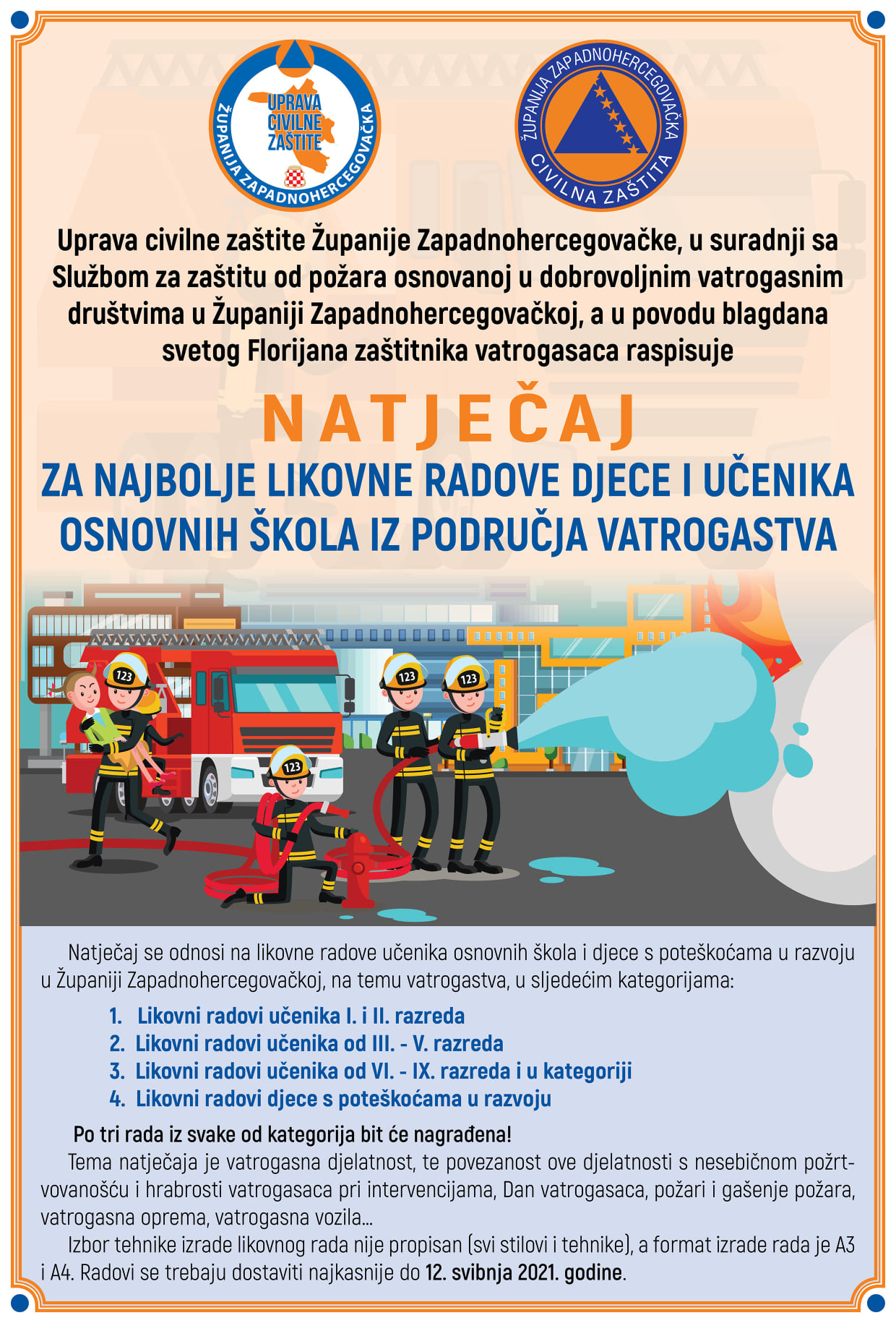Na Natječaj za likovne radove učenika osnovnih škola i djece u poteškoćama u razvoju na temu vatrogastva koji je raspisala Uprava civilne zaštite Županije Zapadnohercegovačke, u suradnji sa županijskom Službom za zaštitu od požara, pristiglo je 965 radova. Na Natječaju su sudjelovali učenici 14 osnovnih škola i djeca s poteškoćama u razvoju u Županiji Zapadnohercegovačkoj. Likovni radovi su razvrstani u četiri kategorije. Prvoplasirani radovi uz novčanu nagradu dobit će i priznanja Uprave civilne zaštite Županije Zapadnohercegovačke. Drugoplasirani i trećeplasirani radovi bit će nagrađeni novčanom nagradom.