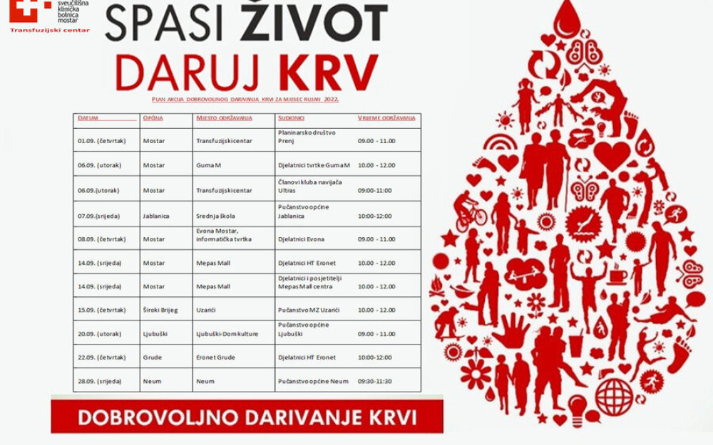 SKB Mostar jutros je objavila plan provođenja dobrovoljnih akcija darivanja krvi za rujan.