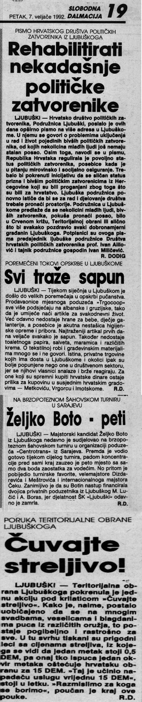 LJUBUŠKI – Teritorijalna obrana Ljubuškoga pokrenula je jednu akciju pod krilaticom »Čuvajte streljivo«. Kako je, naime, postalo uobičajeno da se na mnogim svadbama, veselicama i blagdanima puca iz različitih oružja, to postaje pogibeljno i rastrošno za sve. U tu svrhu tiskani su prigodni leci sa cijenama streljiva, iz koje ga se vidi da jedan metak stoji 0,5 DEM, pa onaj tkoi jedan okvir metaka oštećuje hrvatsku obranu za 15 DEM. »Taj je učinio napadaču uslugu vrijednu 15 DEM«, stoji u letku. »Razmislimo za koga se borimo«, poučan je kraj ove pouke.