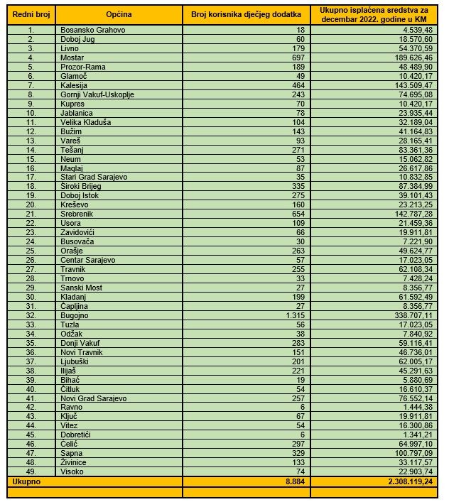 Iz Federalnog ministarstva rada i socijalne politike su istaknuli kako su po osnovu pravosnažnih rješenja isplatili dječje doplatke za ukupno 8.884 korisnika s područja cijele Federacije BiH za što je iz federalnog budžeta izdvojeno 2.308.119,24 KM.