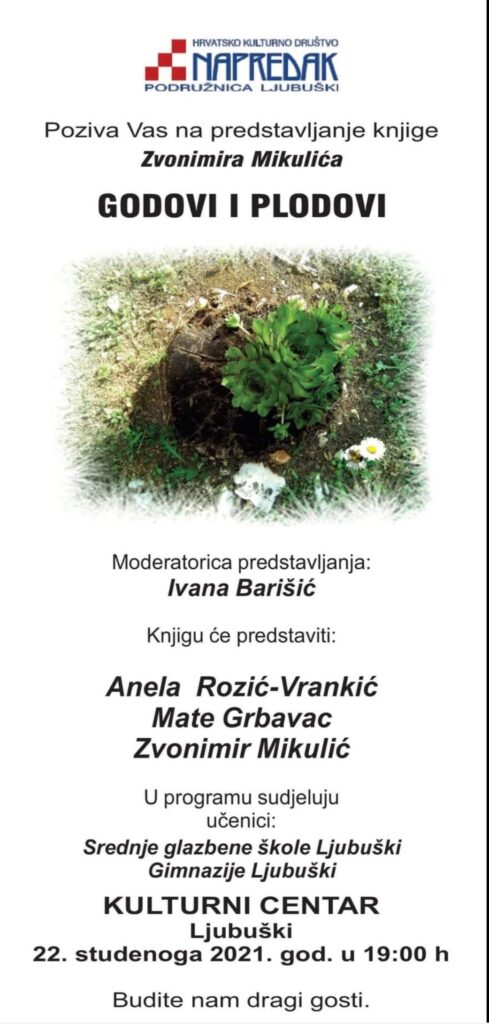 U Kulturnom centru u Ljubuškom u ponedjeljak, 22. studenog, s početkom u 19 sati upriličiti će se predstavljanje zbirke poezije „Godovi i plodovi“, autora Zvonimira Mikulića.
