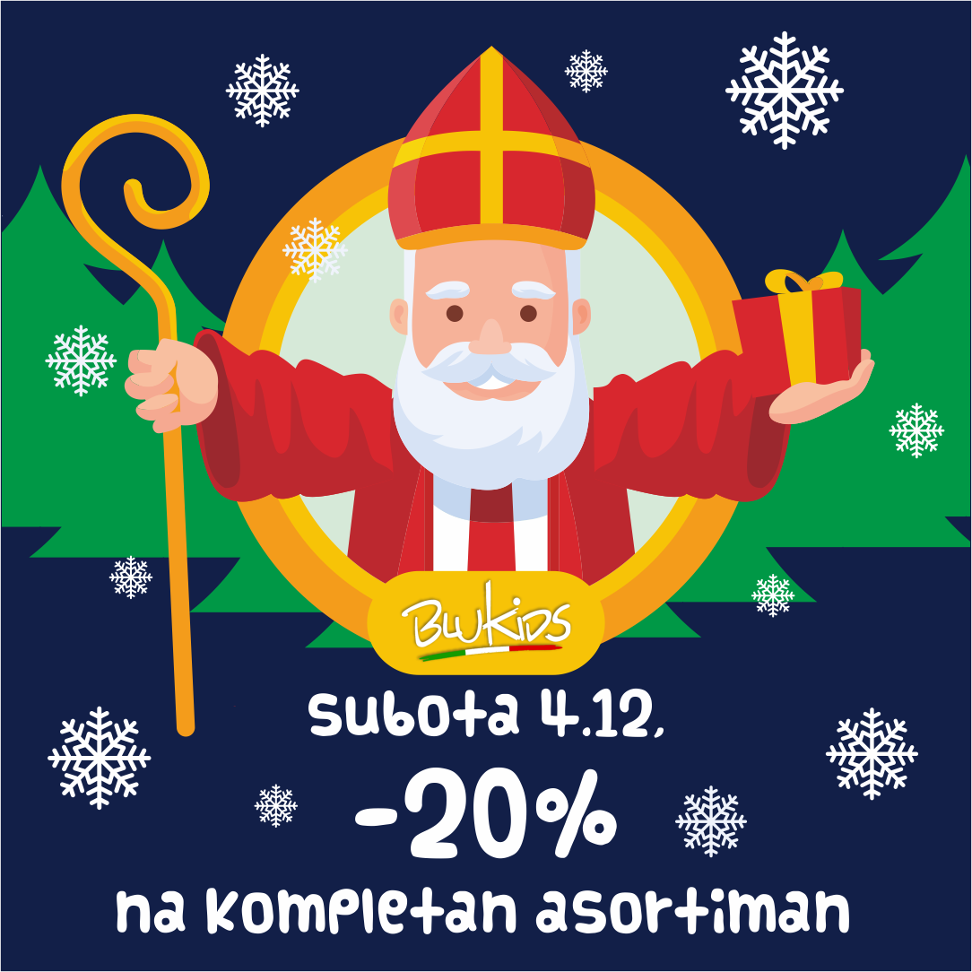 03.12.2021 Najave i promocije Dragi kupci, U susret Svetom Nikoli trgovina Blukids daruje vas popustom od 20 % na kompletan asortiman trgovine u subotu,04.12.2021.g. Popust od 20 % vas očekuje u trgovinama Blukids Međugorje,Mostar i Široki Brijeg. pro 3, 2021Slovojed