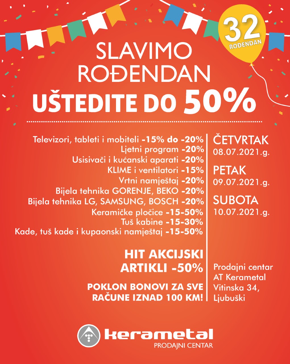 Prodajni centar Kerametal slavi 32. rođendan i u slavljeničkom raspoloženju pripremili smo za vas veliku rođendansku akciju.