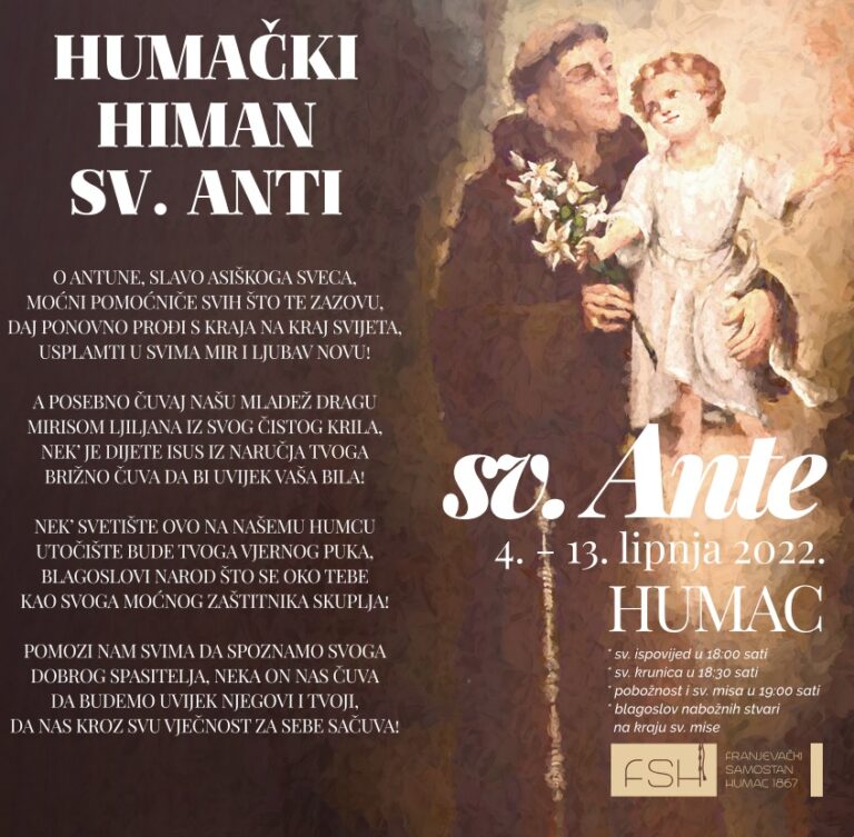 „Svako vrijeme nosi svoju težinu i za svako znamo reći da je najteže, ali Gospodin nam stalno ponavlja da smo Njegova ljubljena djeca. Nije nas ostavio, nego je uz nas! Kušnje, poteškoće i patnje ojačavaju nas da se vratimo Gospodinu i da se oslonimo na Njega, da shvatimo da nismo svemoćni i da ne možemo sami, nego da nam je potrebna Njegova pomoć, upravo onako kako je to činio i sv. Ante! Neka ova Devetnica i sami blagdan budu svima na duhovnu izgradnju i pomoć, a navlastito onima koji su iznemogli, klonuli, padaju i ne mogu se dići. Neka nas sv. Ante, naš zaštitnik zakrili i zagovara“, navodi se u poruci fratara s Humca.