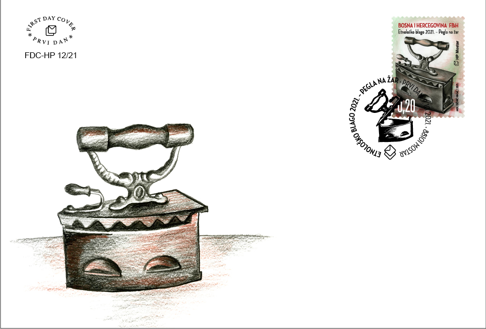 Hrvatska pošta (HP) Mostar tradicionalno je, uz Svjetski dan pošte koji se obilježava 9. listopada, tiskala redovitu poštansku marku „Etnološko blago 2021.“ Odijevanje je, u početku, nastalo iz ljudske potrebe da zaštiti tijelo od vanjskih utjecaja. S vremenom je postalo znak civiliziranosti, a onda se javila potreba da se uljepša izgled. S vremenom, uz mnoga pomagala koja su se koristila za ljepši izgled odjeće, pojavila se pegla (glačalo). U 1. stoljeću p.n.e. Kinezi su koristili metalne plitice napunjene žarom, a u ranom 16. stoljeću počinju se upotrebljavati trokutaste debele ploče od lijevanog željeza. Izum Amerikanke Mary Florence Potts u 19. stoljeću bila je pegla za odjeću s odvojivom drškom. Kasnije dolaze pegle koje su se su zagrijavale nakupljanjem topline na pećima ili su se iznutra zagrijavale žarom i gorivima. Prvu električnu peglu patentirao je Amerikanac Henry W. Seeley 1882.