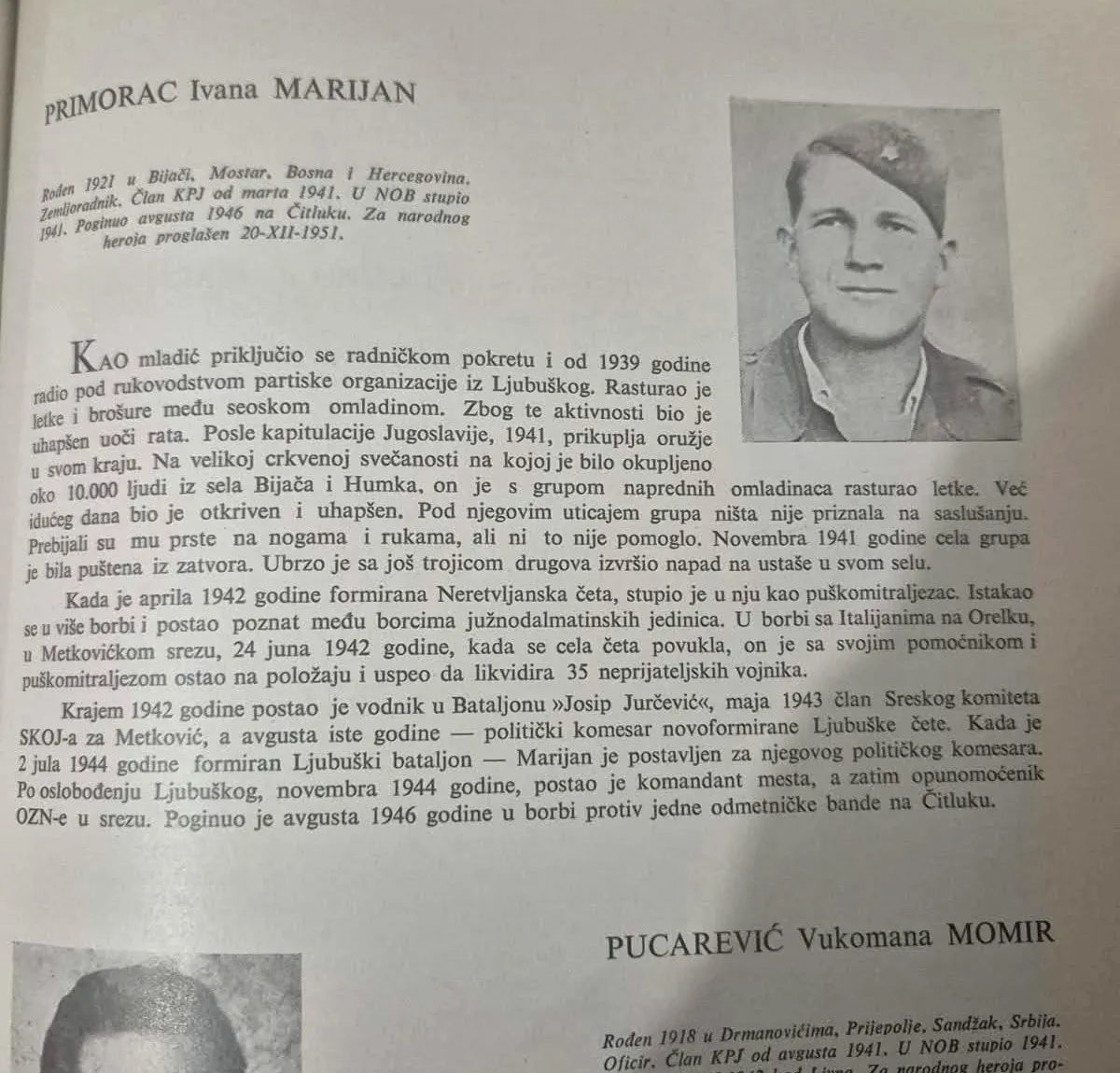Na fotografiji je Marijan Primorac ( Ivanov) partizanski narodni heroj iz Ljubuškog koji je, kako piše u biografiji, “poginuo 1946. godine u borbi protiv odmetničke bande u Čitluku”. Narodnim herojem je proglašen 1951. godine.