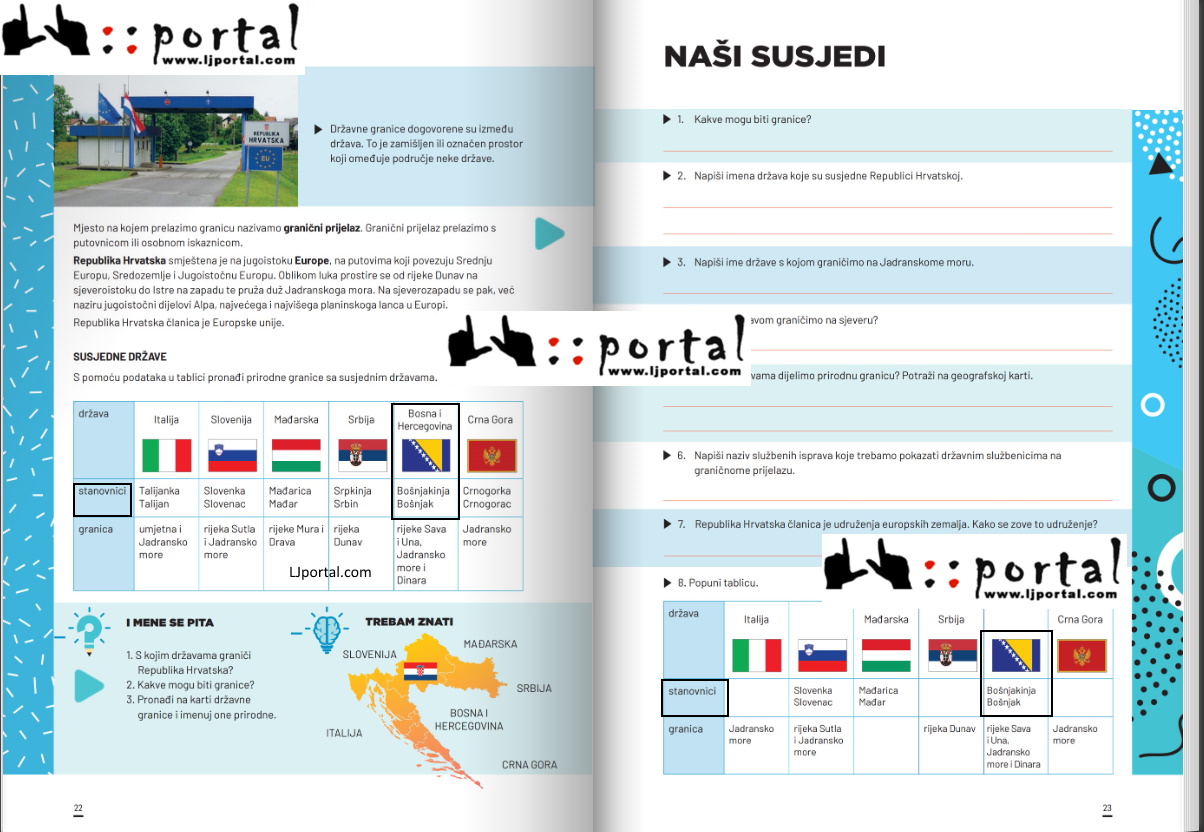 U lekciji koja govori o granicama Republike Hrvatske, kao i tko su joj susjedi, navodi se kako je Republika Hrvatska smještena na jugoistoku Europe, što je politički prihvatljiv termin za Zagreb. Nakon toga navode se susjedne države Republike Hrvatske te se od učenika traži da pronađu “prirodne granice”. Uz zastave država navedene su prirodne granice, koje su u slučaju BiH rijeke Sava i Una, Jadransko more i Dinara. Poseban dio odnosi se na stanovnike. Uz BiH stoji da tamo žive Bošnjakinja i Bošnjak. Ovaj udžbenik za Profil Klett kao izdavača potpisuje Dalibor Greganić, direktorica uredništva je Petra Stipaničev Glamuzina, dok su recenzentice profesorice Vida Bilogorević Gatolin i Manuela Kujundžić te Tvrtko Pleić, magistar edukacije, a lektorica odnosno korektorica još je jedna profesorica, Tanja Skiba. Odobrenje za tiskanje ovoga udžbenika za IV. razred osnovne škole dalo je i Ministarstvo znanosti i obrazovanja Republike Hrvatske u svibnju 2021. godine. Navođenje isključivo Bošnjaka i Bošnjakinja kao stanovnika u Bosni i Hercegovini izazvalo je reagiranja i drugih roditelja, tvrdi naš sugovornik, kazavši kako je žalosno da se ovako uči djecu u Hrvatskoj. – Ovo je žalosno. Iskreno sam razočaran ovom, slobodno mogu reći, provokacijom. Čak i površni poznavatelji prilika znaju da u BiH žive Hrvati, Srbi i Bošnjaci, a ne samo Bošnjaci – rekao je Večernjakov sugovornik. Stvari su još gore ako se ima na umu da bi ovaj udžbenik morao proći najmanje četiri filtra osim njegovih autora koji ga potpisuju. To su urednik, izdavač, korektor . te na kraju i samo Ministarstvo ‘ znanosti i obrazovanja. Da su autori kojim slučajem na tražilici Google upisali samo naziv “Bosna i Hercegovina” pa potražili “izvore” s inače nepouzdane Wikipedije, mogli bi zaključiti kako “u BiH žive tri konstitutivna naroda”.