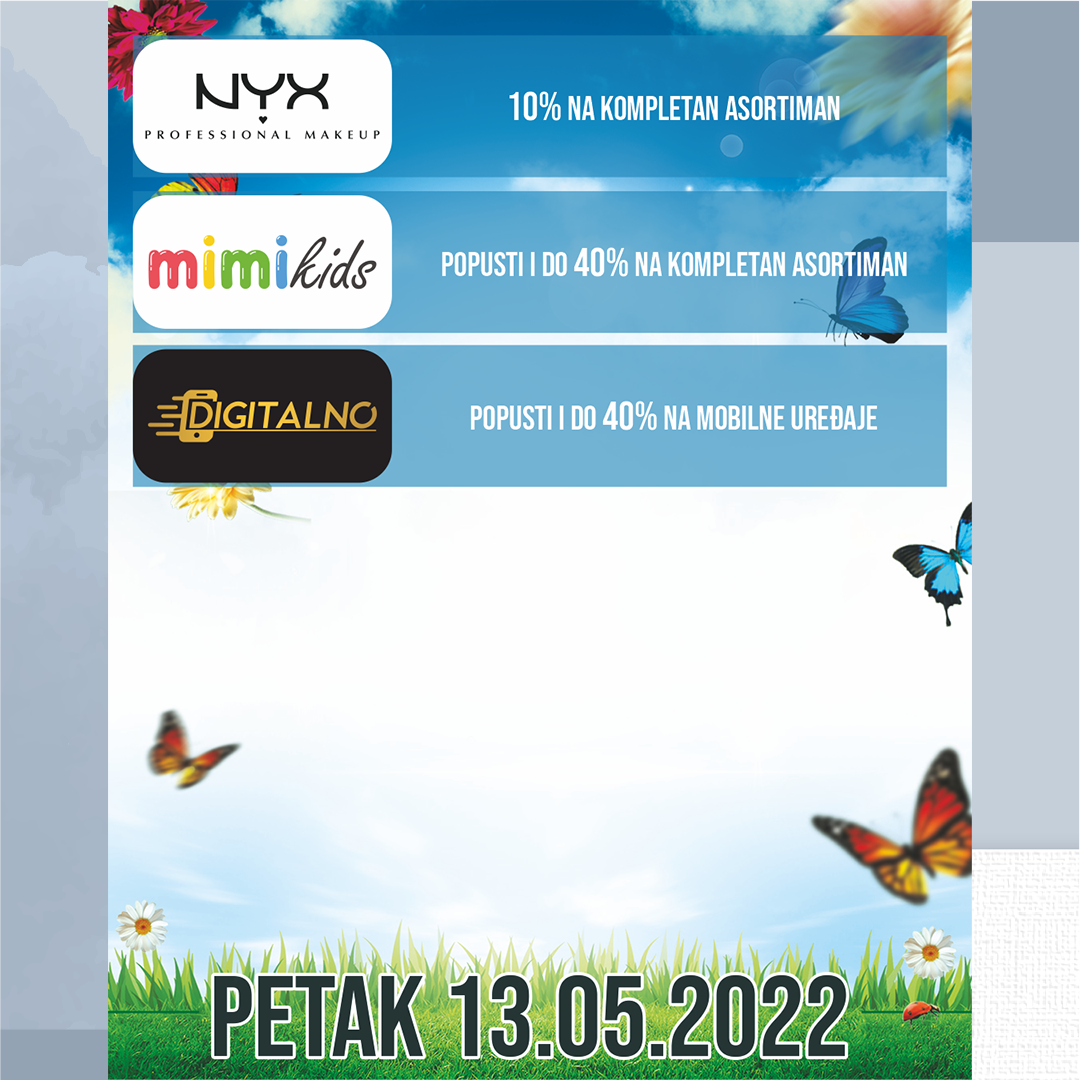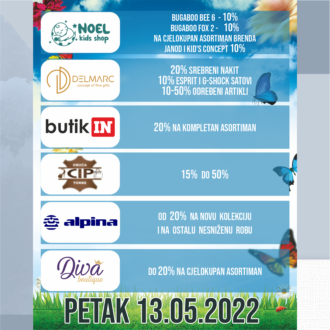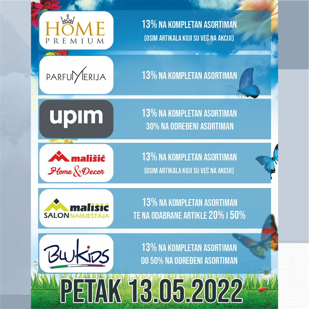 Ovog petka,13.svibnja iskoristite prigodu za shopping u prodajnom centru Mališić Međugorje gdje vas očekuje dan odličnih popusta i pogodnosti u svim trgovinama.