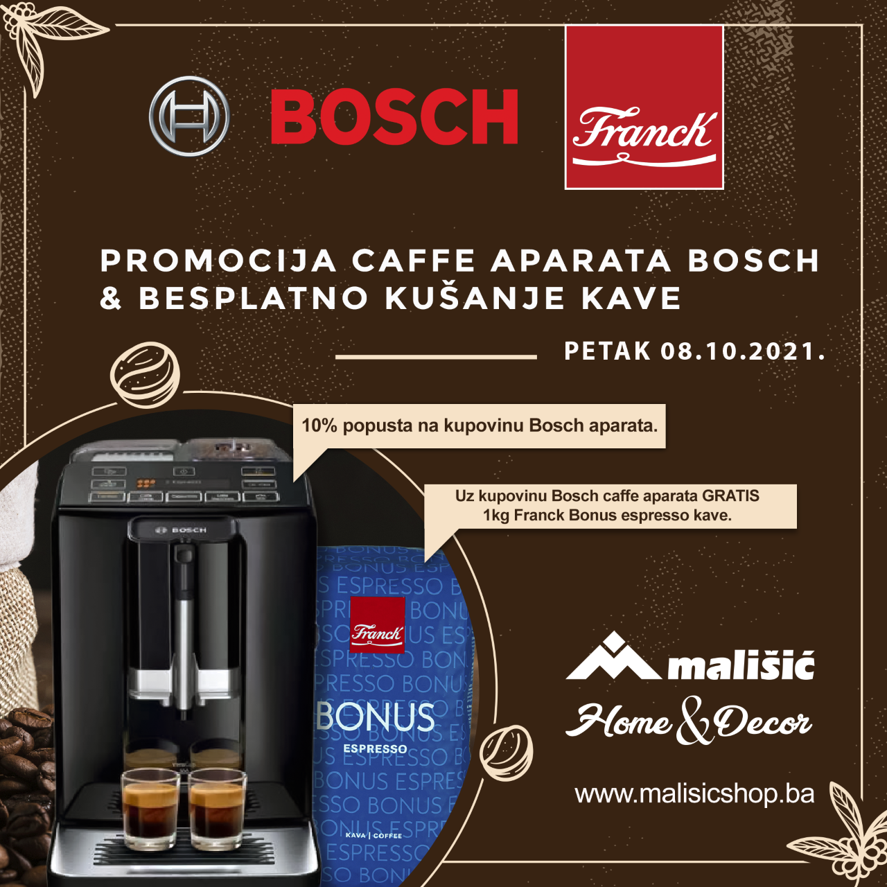 ☑ Mališić Home&Decor // 10 % na kompletan asortiman // do 50 % na odabrani asortiman + promocija caffe aparata Bosch & besplatno kušanje kave uz akcijski popust 10 % za kupovinu Bosch aparata za kavu i GRATIS kavu 1 kg Franck.