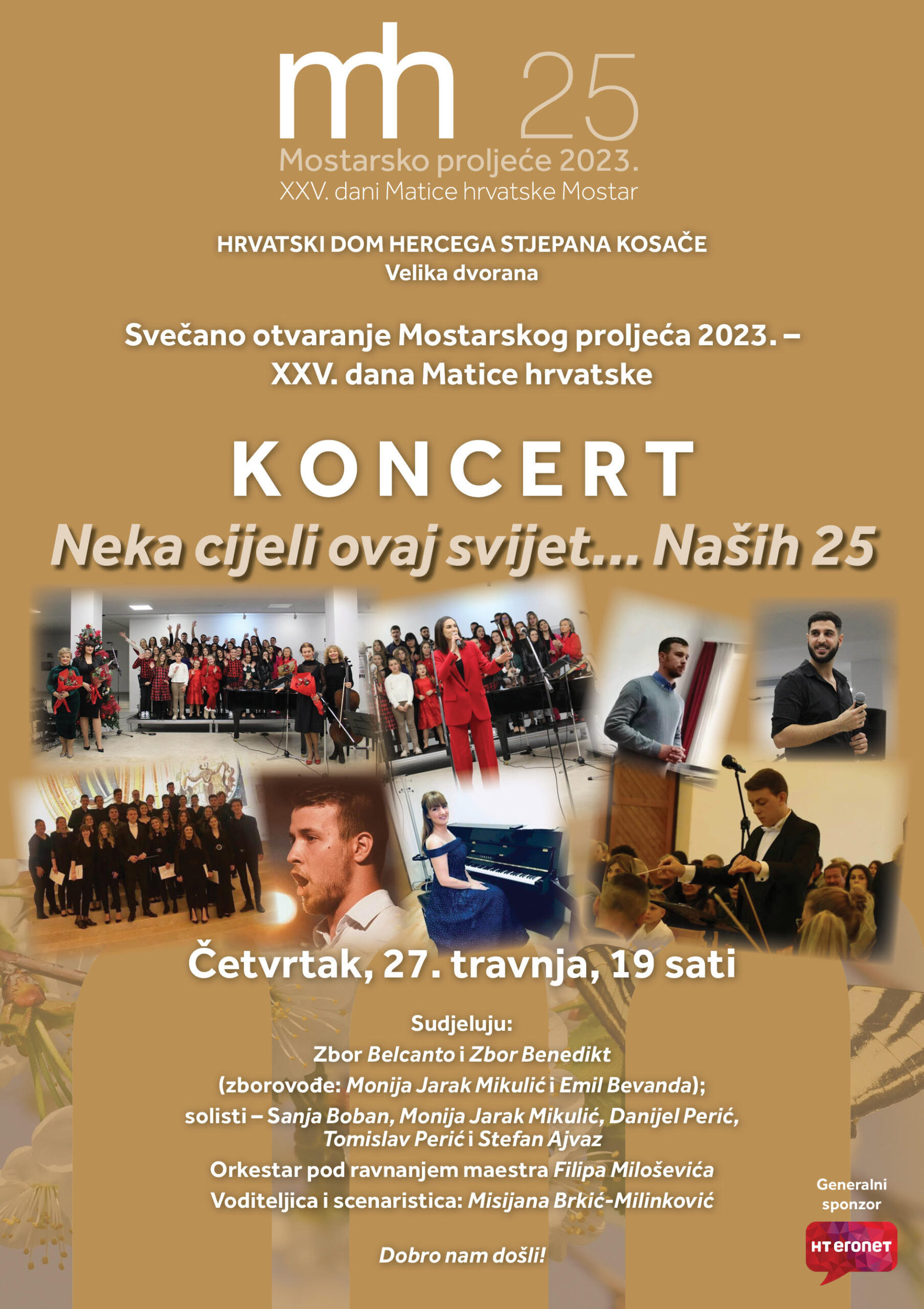 Koncertom Neka cijeli ovaj svijet… Naših 25 u četvrtak, 27. travnja u velikoj dvorani Hrvatskoga doma hercega Stjepana Kosače u 19 sati bit će svečano otvoreno jubilarno, 25. Mostarsko proljeće – Dani Matice hrvatske Mostar.