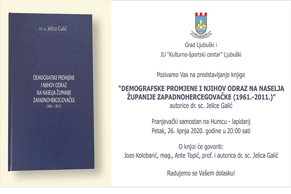 Grad Ljubuški i JU “Kulturno-športski centar” Ljubuški pozivamo Vas na predstavljanje knjige “DEMOGRAFSKE PROMJENE I NJIHOV ODRAZ NA NASELJA ŽUPANIJE ZAPADNOHERCEGOVAČKE (1961.-2011.)” autorice dr. sc. Jelice Galić.