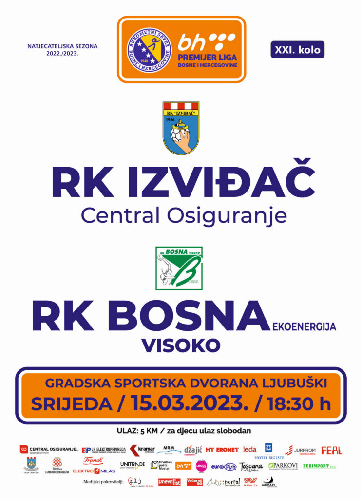 Utakmica između rukometaša Izviđača Central osiguranje i Bosne igra se u srijedu, 15.03.2023. godine u Gradskoj športskoj dvorani s početkom u 18:30 sati.
